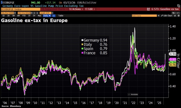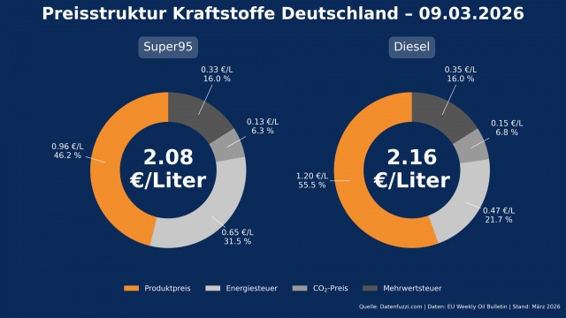 Ja, der Krieg verursacht einen Anstieg des Ölpreis. Doch mit über 1 EUR (!) Steuern auf Treibstoffe, verteuert die dt. ReGIERung die Treibstoffe massiv und zockt die Bürger regelrecht in Deutschland ab.