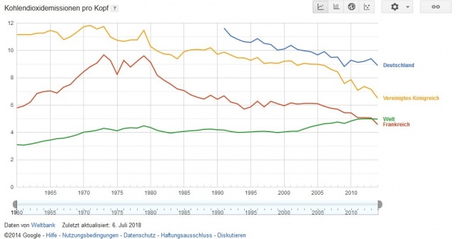 ... Man möge mir bitte erklären, ob es in grünen Kreisen zum Allgemeinwissen gehört, dass die CO2-Emissionen in Europa in den letzten Jahren massiv gesunken und die weltweiten CO2-Emissionen gleichzeitig gestiegen sind. Ferner interessiert mich, was man sich von immer radikaleren regionalen Maßnahmen zur Vermeidung von CO2 konkret verspricht angesichts der Tatsache, dass