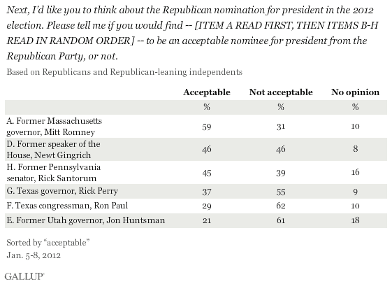 Romney ist momentan der Einzige, den eine absolute Mehrheit für akzeptabel hält; die nächsten Herausforderer Gingrich und Santorum stehen auch in dieser Frage - wie auch in der simplen Frage nach der Präferenz des Befragten an sich - weit hinter ihm.