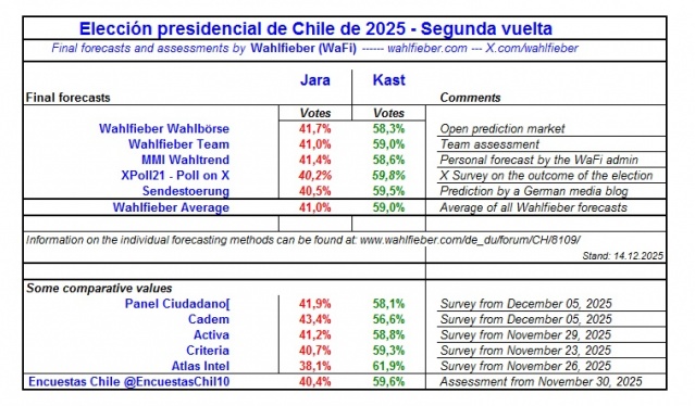 Da in Chile keine weiteren Umfragen veröffentlicht werden (in den letzten 14 Tagen vor der Wahl herrscht diesbezüglich Funkstille), hier schon einmal die aktuell vorliegenden 16 Einschätzungen - Stand: 09.11.2025 - ...